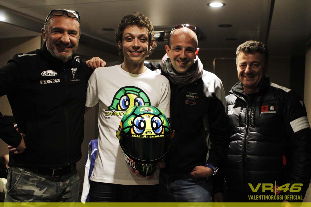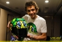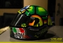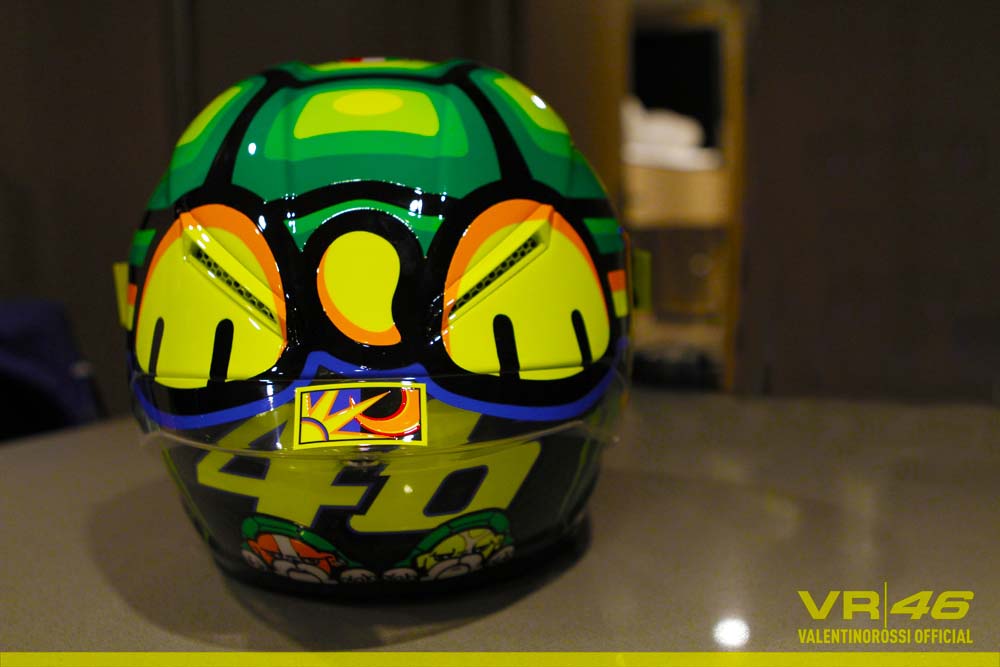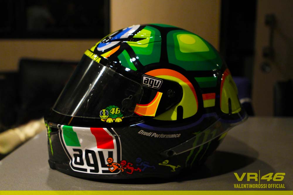 Another Italian GP at Mugello, and another special AGV helmet for Valentino Rossi. A wink to his new non-alien status, Rossi’s AGV Pista GP lid is obviously painted up like a turtleshell, implying the Italian’s pace to his rivals (note the colored figures running along the chin bar of the helmet).