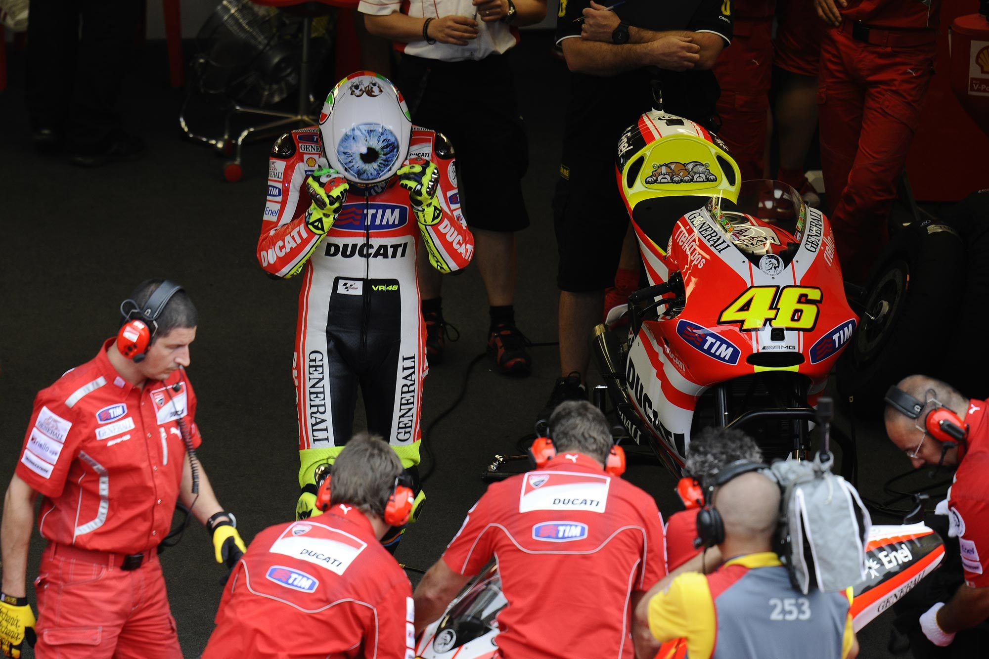 Despite Valentino Rossi getting the Ducati Desmosedici GP11.1 for the Italian GP at Mugello, the nine-time World Champion is still struggling with a 12th place qualifying position. Despite his troubles, Rossi is keeping true to his tradition of wearing a special AGV helmet at his home GP round. Featuring a giant eyeball on the top of the lid (Rossi’s bulldogs are featured on the back of the helmet), we can only imagine Rossi is paying with the fact that all eyes are on him this year as he tackles the new challenges that surround his move to Ducati Corse.