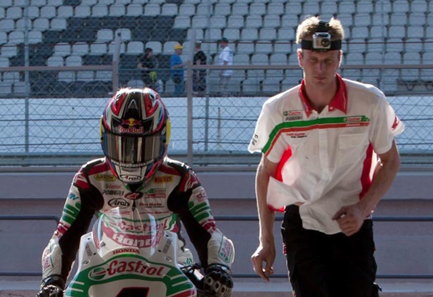 Taking the pole position at the final World Superbike round at Portimao, Jonathan Rea not only put his Castrol Honda on the front of the grid, but also broke set the fastest lap ever for a motorcycle at the Portuguese track. Fortuitously, the factory Honda WSBK team fitted one of its mechanics with a GoPro camera to capture the Superpole from the team’s point-of-view. At 6’10” tall (2.1 meters), the view provided by Daniel Postmus is not only one that few get to witness in side the team garage, but also comes from an altitude slightly higher than many are accustomed.