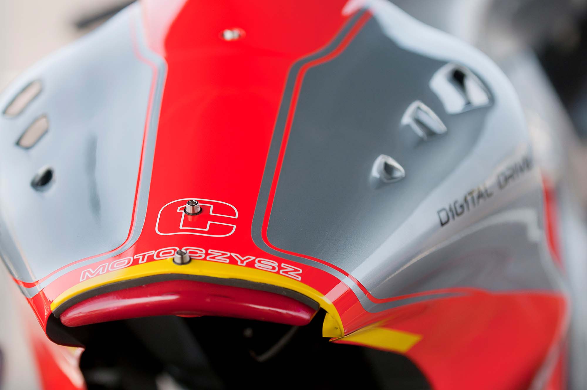 The result of all this work is that the 2012 MotoCzysz E1pc, with all its fins and ducts, looks like something similar to the bastard child that was consummated when the art deco movement got drunk late one Thursday night and made sweet love to a neon-clad Buck Rogers.