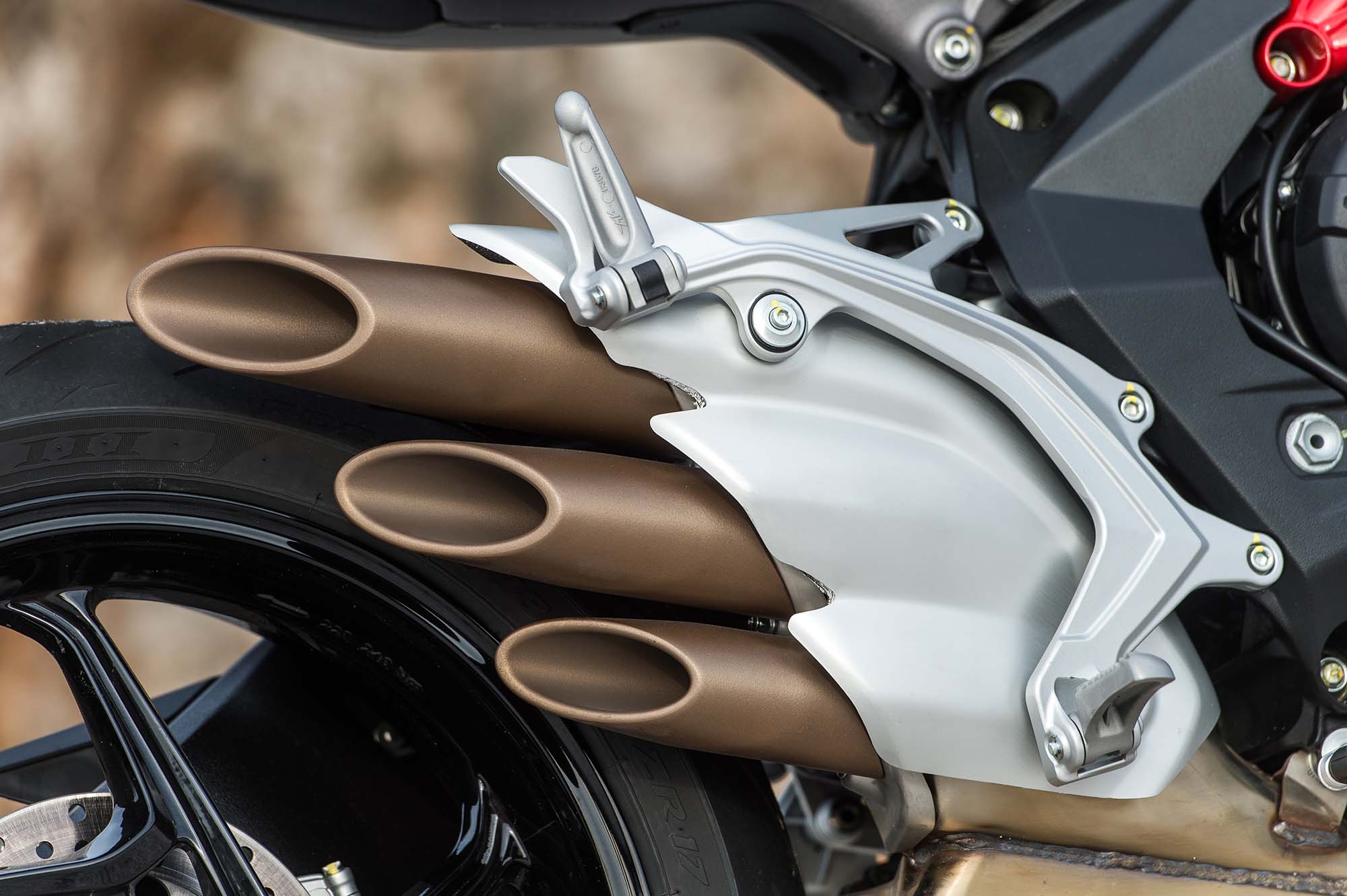 Of bigger issue is the rearset on the right-hand side of the Brutale 800, which has a compromised heal clearance due to the three-pipe exhaust system.