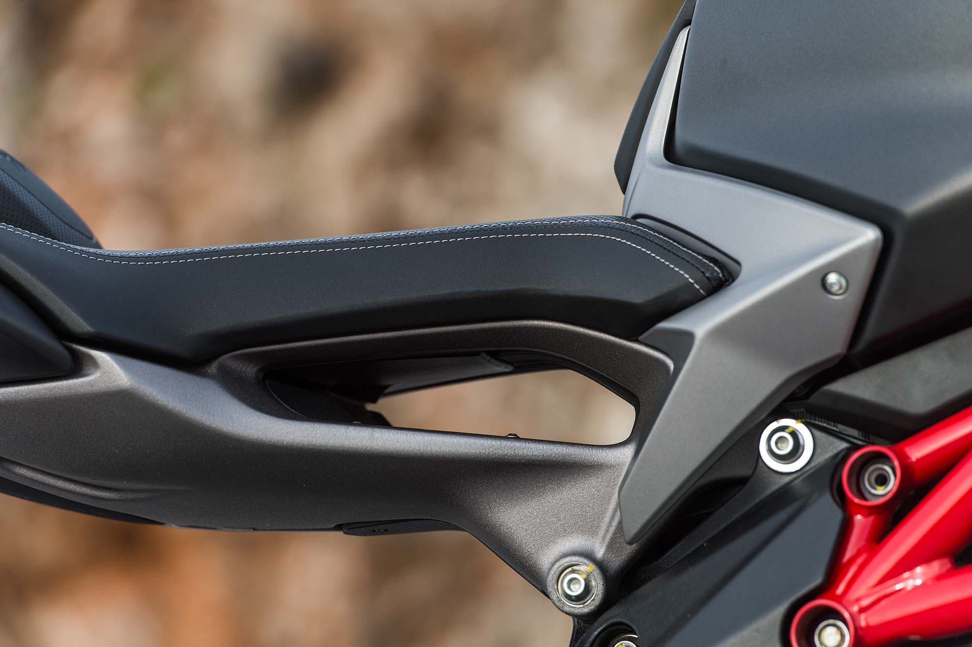 The affect doesn’t rise to the torture-rack levels of the Ducati Streetfighter 1098, but even after our short sessions through the mountains, my knee was feeling the effects of having to be the joint that gives while leaned over.