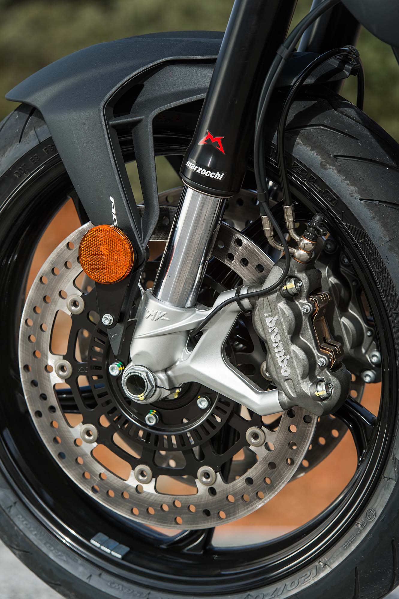 Fitted with Marzocchi forks and a Sachs rear shock, the suspension on the 2016 MV Agusta Brutale 800 is fully adjustable. Our bike was set up with settings that seemed to favor heavier riders, who like a moderately stiff ride from their motorcycle.