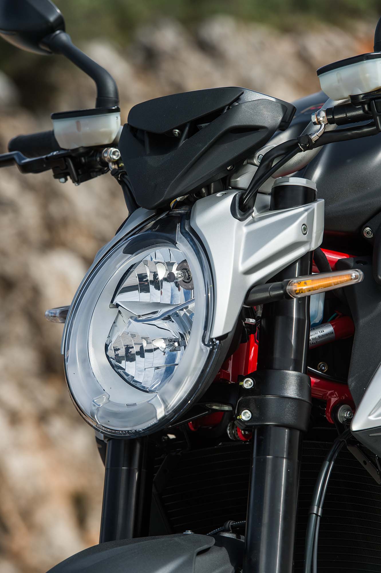 This is because on the left-hand control cluster, MV Agusta continues to put the horn button where the turn signal switch is on almost every other motorcycle, and vice versa.
