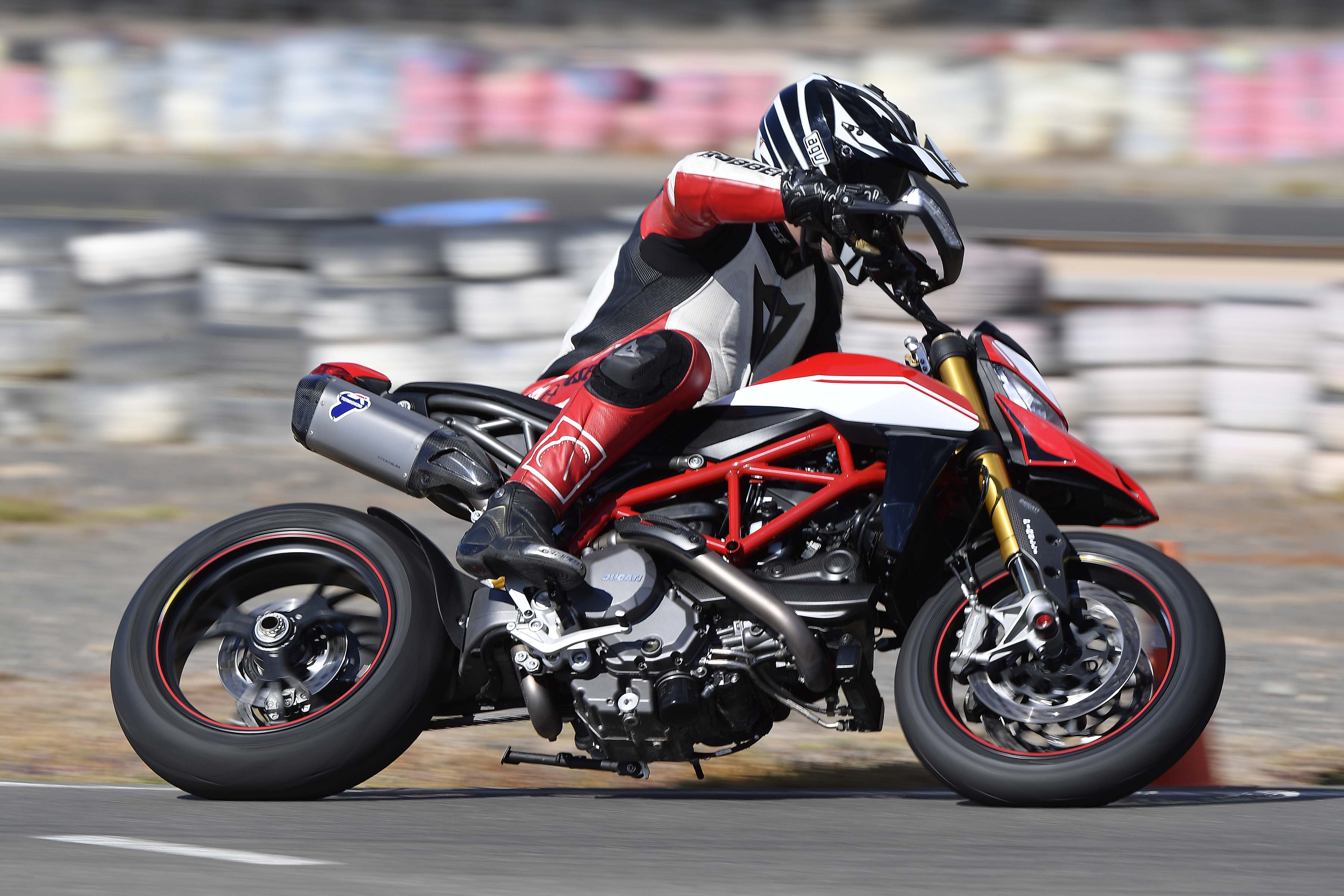 Perhaps we over-indulged though, as while the Hypermotard 950 SP boasts an improved lean angle over the base model (thanks to the taller suspension pieces), the maximum angle is still a paltry 47° of lean.