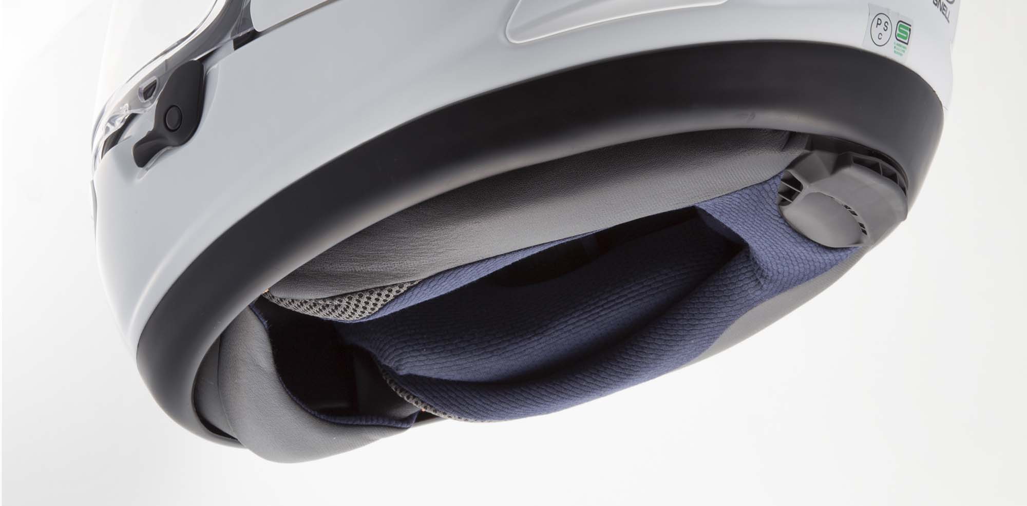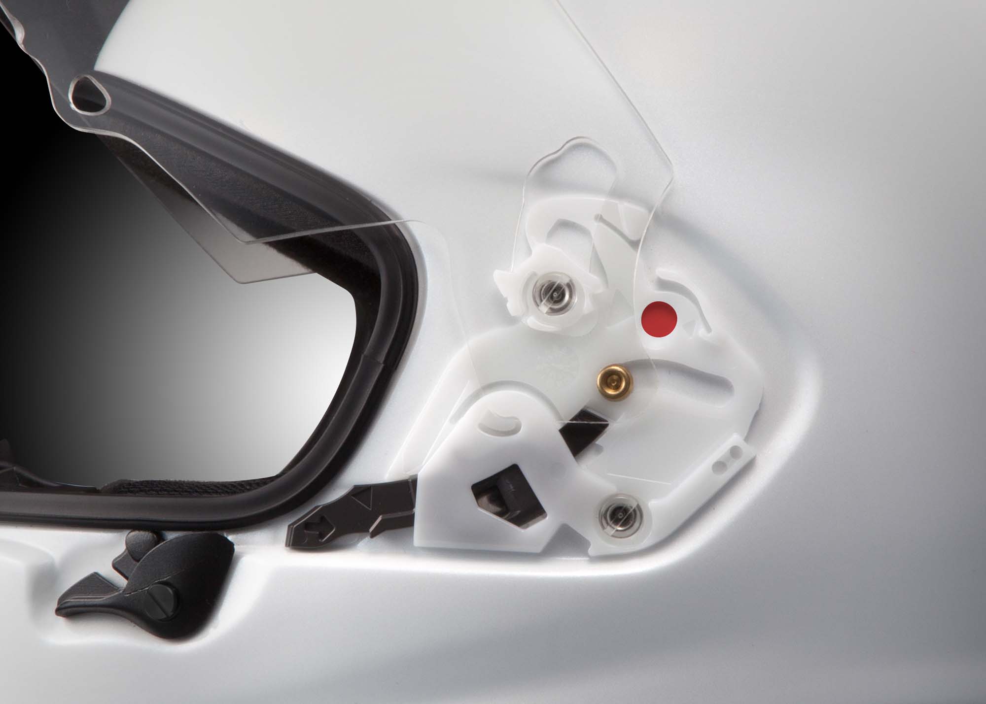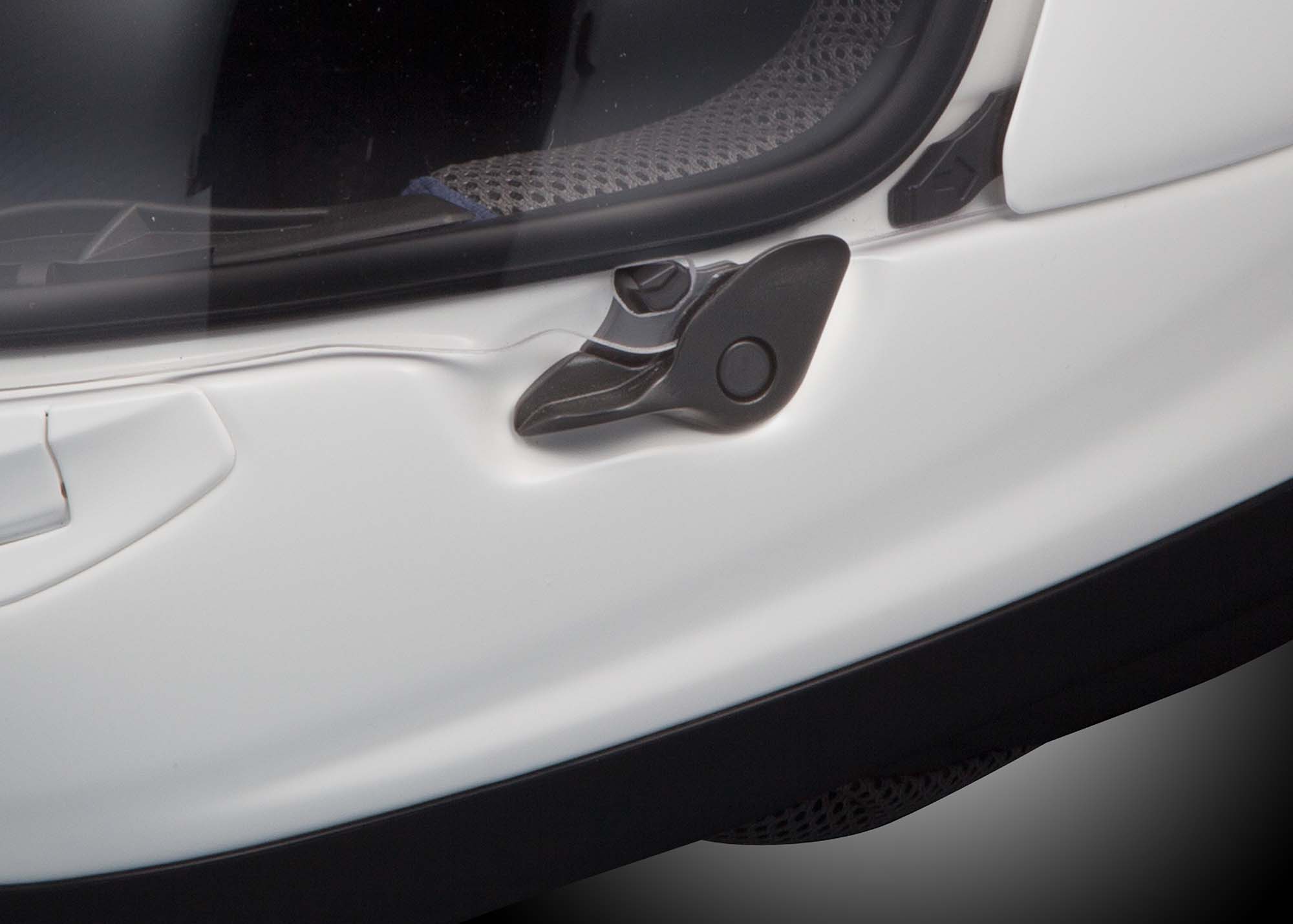 Moving on, I could probably devote a lot of words to the new Arai pod system. Arai’s helmet latch system comes about from the company’s unwillingness to cut into its shells, thus keeping the integrity of the helmet shell in place.
