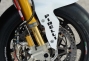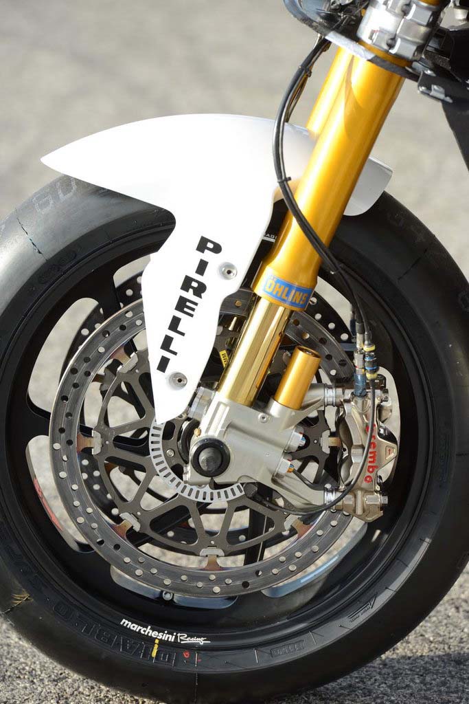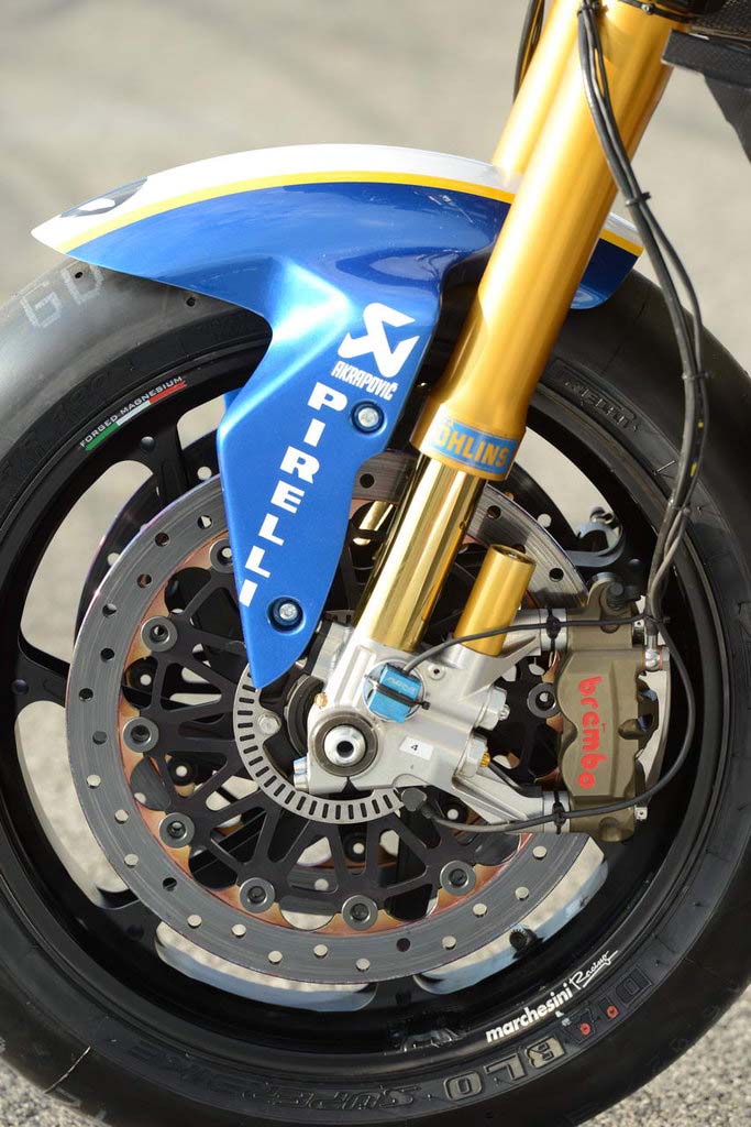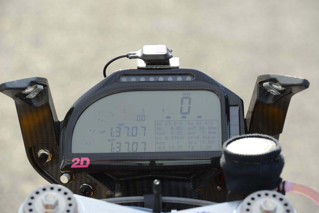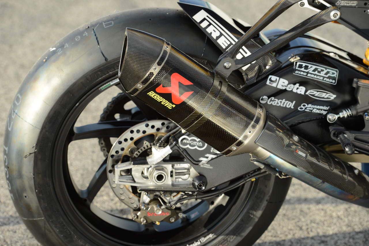 The weight distribution is heavily positioned towards the front, just how Haslam likes it, but the effect is less so when compared to last year, and in the slow turns this offers an incredible sense of security and stability, combined with an ease in changing direction that is truly incredible. All this sense of security in the tight corners translates negatively to the fast curves. At Misano, in the “Curvone turn” one enters in fifth gear flat out, and in that instant Haslam’s bike vibrates and chatters noticeably at the front fork which is not exactly confidence inspiring. This is probably due to a stiff setup on the front Öhlins suspension, and one possible fix might be to enter the turn with less weight on the front of the bike (maybe this is how Leon rides it), but in all honesty, with a bike of such value, I didn’t feel up to the task of entering the Curvone at full-tilt and leaving the front of the bike to its own devices to decide my destiny.