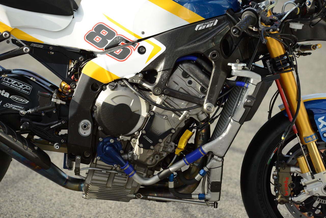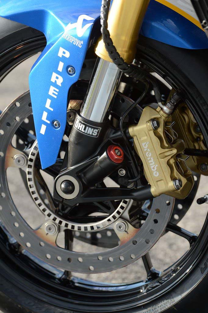 The riding position is dramatic: Leon uses very low clip-ons, which are tight and angle downward greatly, and the rearsets are high and to the back, so I’m forced to completely change my style of riding within just a few short kilometers. With the clip-ons so down low, I’m forced to throw myself off the bike in the slow turns to make the machine pivot, to which the S1000RR responds in a smooth and obedient manner… until I open the throttle. Lets just say that if last year’s factory team S1000RR had impressed me with the vigor of its power delivery at medium revs, then now the inline-four is downright pleasurable, as it enjoys exhibiting its power with interminable wheelies which cannot be placated even by kicking the bike into fourth gear.