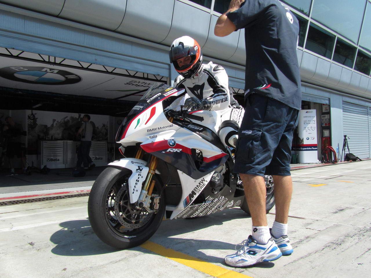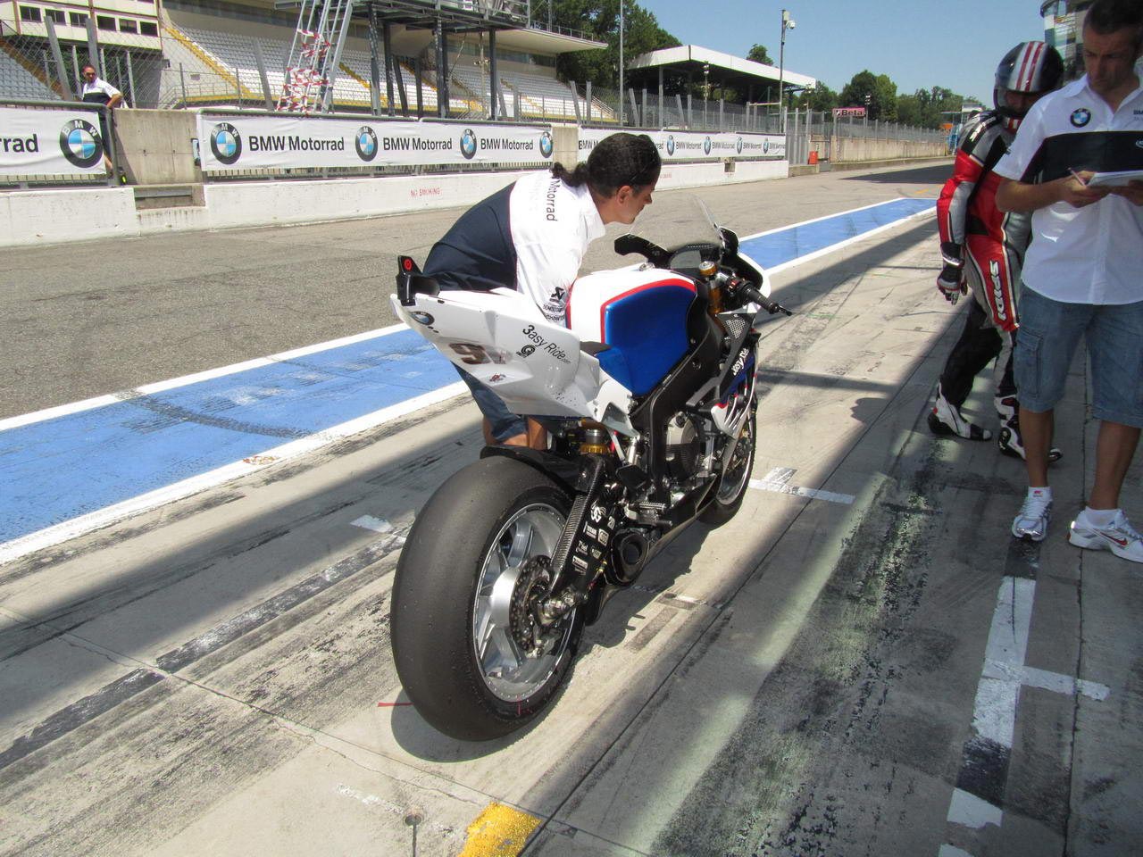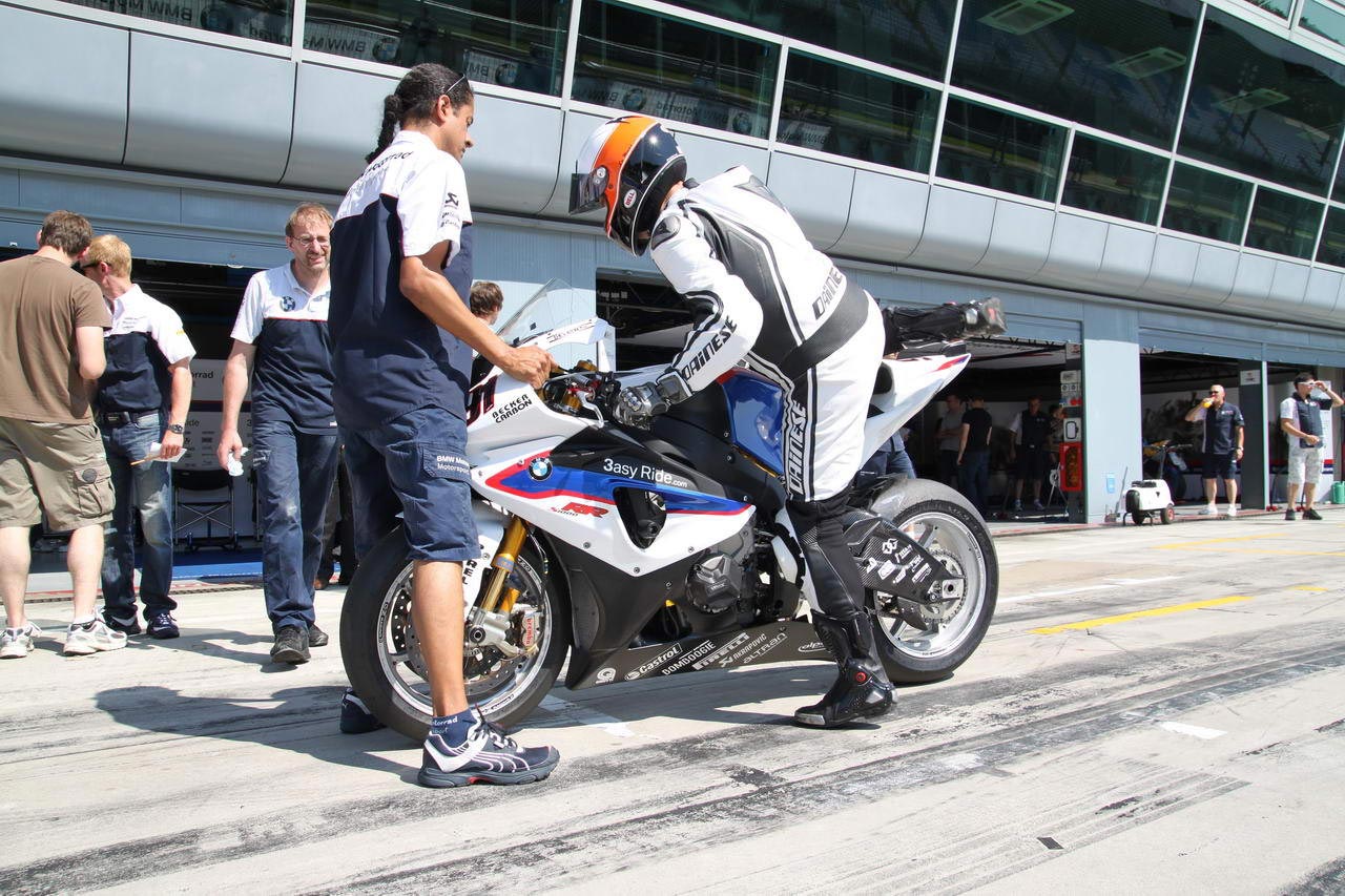 The first surprise in the Monza test came from the S1000RR Superstock bike of Sylvain Barrier. I had tried this bike last year when Ayrton Badovini was riding on it, and even though I was working for another brand, I had enjoyed the ride enormously. With now a year having passed, I sat on this bike almost petrified by the differences that had occurred to this motorcycle over the past months. Ayrton’s bike from last year was easy, with supple suspension, and was well manageable in the braking zones, while Barrier’s bike from this year was hard like a rock. The French rider expects a very controlled ride, so consequently his forks have very rigid settings. This means that one must be absolutely on top of what he wants to do with the bike, because with a front-end that is so stiff, there are few possibilities for trajectory changes once you are set in a turn.