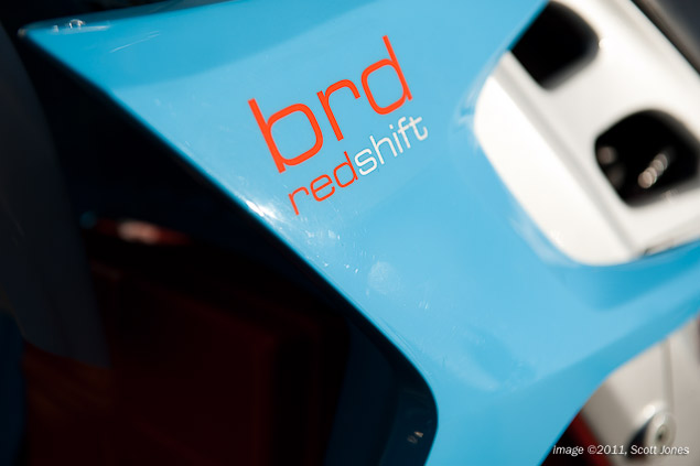 The reason for the difference is two-fold, as the original plastic tail piece was made from a brittle rapid-prototype plastic, and thus wasn’t up to the performance specs that BRD wanted for the RedShift. Second, with the final ergonomics of the RedShift still in flux, the metal sub-frame design allows BRD to adjust the tail to various dimensions, and also try different tail plastic designs while in the prototype phase. BRD says the plastic monocoque tail will come on the production bike as planned, but only after the team has settled on its final design parameters.