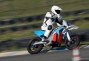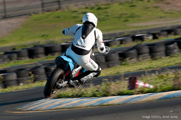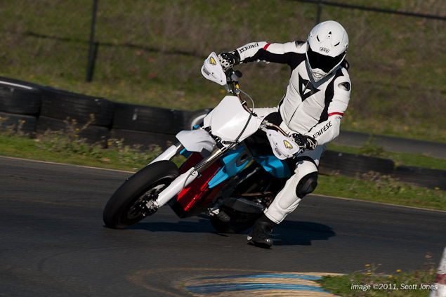 Braking, thanks to the Brembo monoblock caliper and radial master cylinder, is crisp, strong, and precise. The upright supermoto bars make it easy to brace while under hard braking and going into a corner, and of course the wide hand positions help create subtle steering adjustments. Overall the riding positions is comfortable, though I imagine the rigors of track riding help one forget the MX-style Corbin seat, which surely would make its presence known on longer around-town rides.