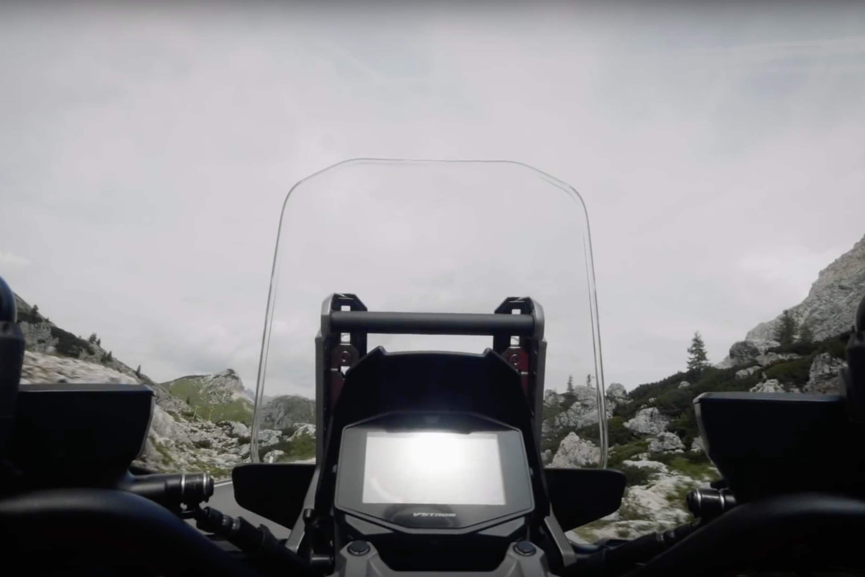 From the rider’s perspective we see a dash that looks similar to the rally towers on Dakar bikes, with what we presume is a TFT screen. Here, the name “V-Strom” can be clearly seen.