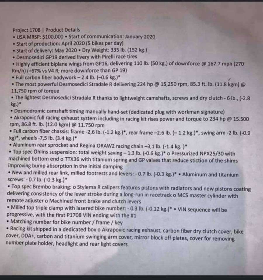 Today, we get our first glimpse of the specs, which have been leaked onto the internet (shown at the end of this story). How does 234hp, 335 lbs dry (152kg), MotoGP-derived biplanes aerodynamic wings, and of course unobtanium at every detail, sound to you?.
