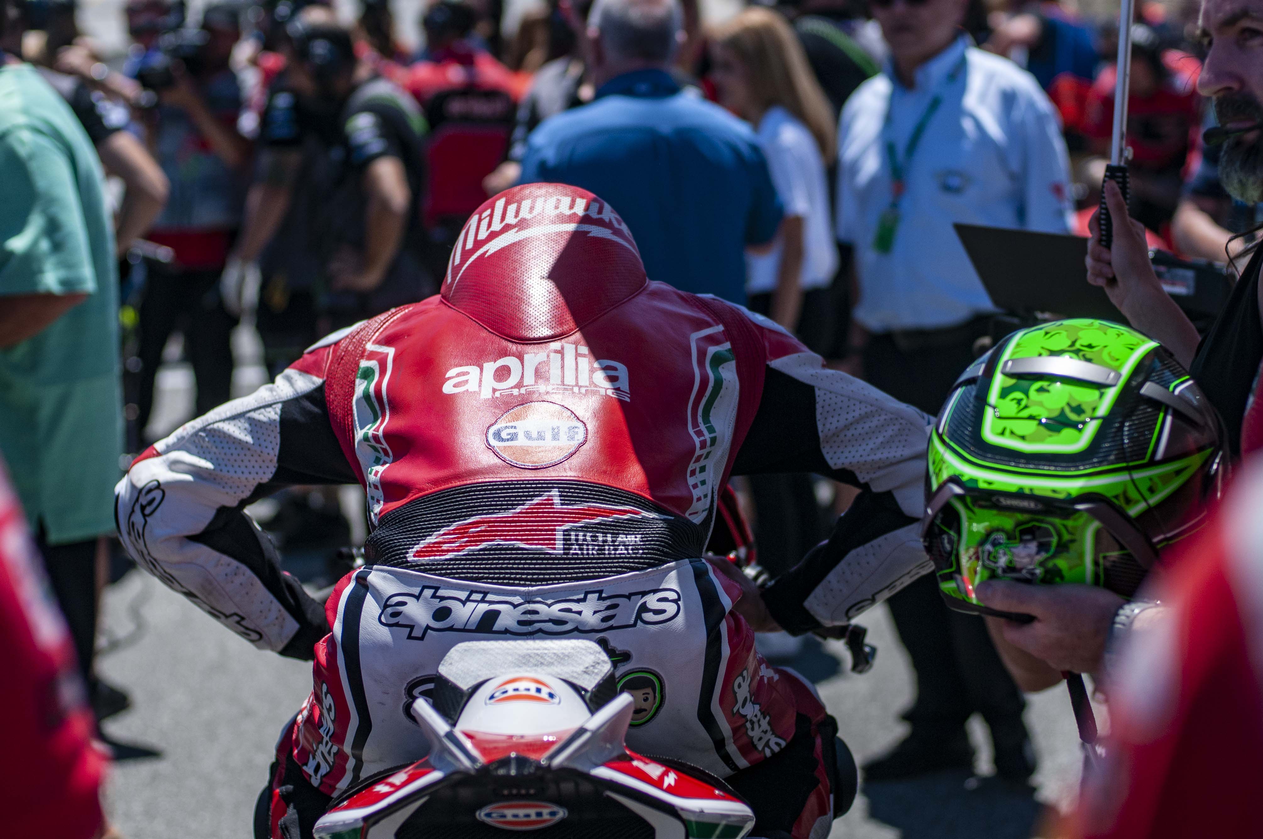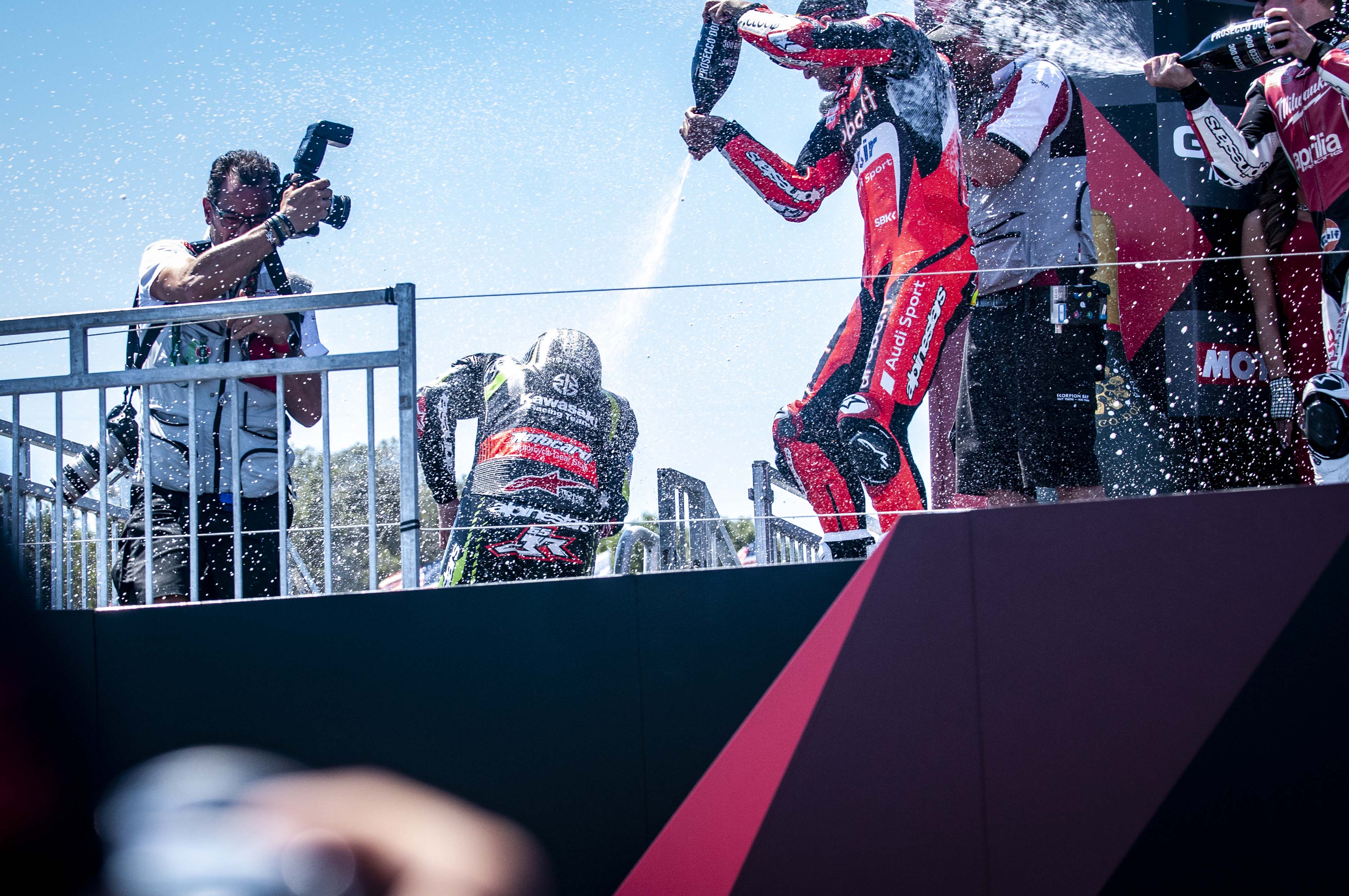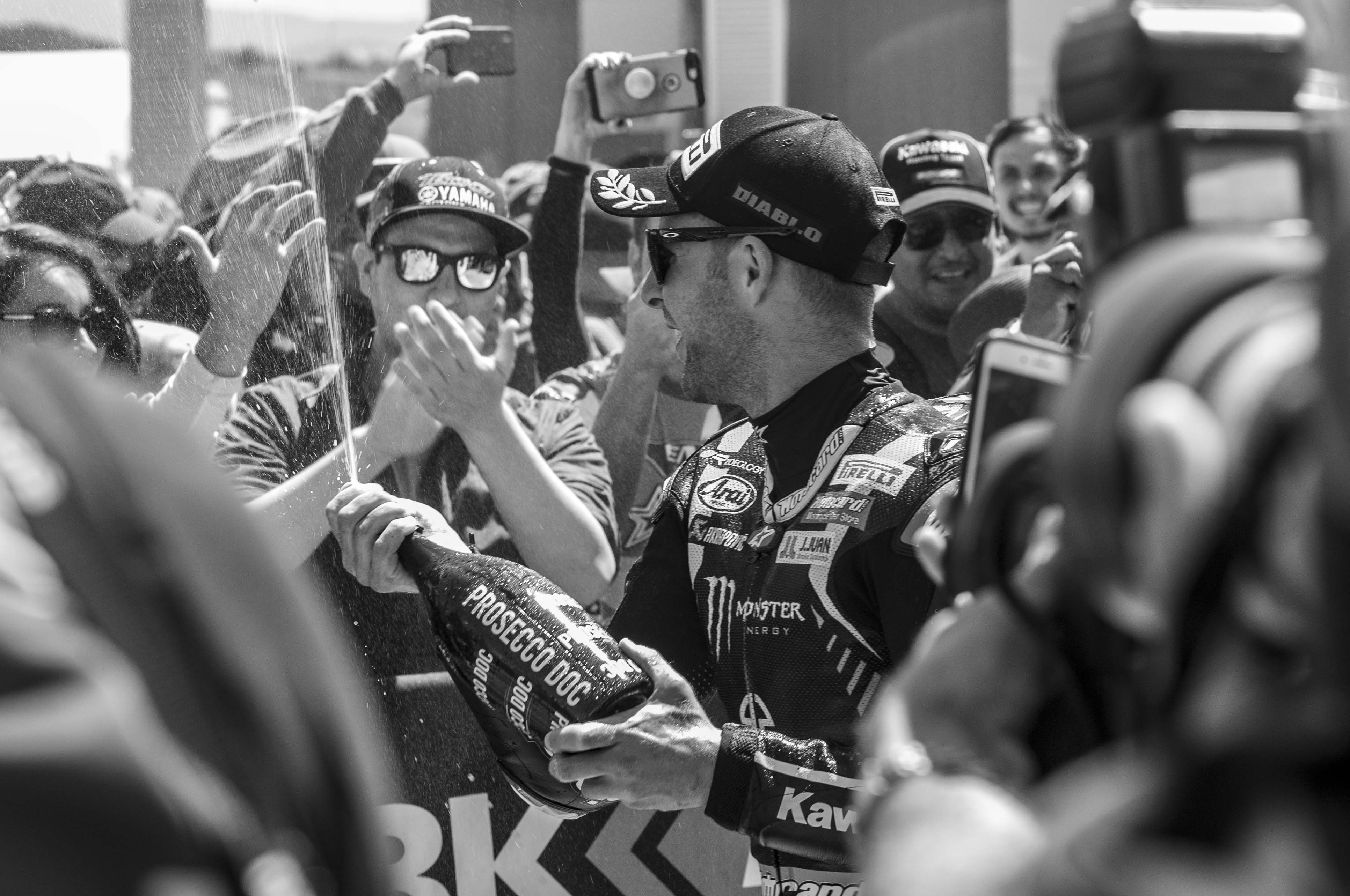 If you do this 20 or so times faster than anyone else, you find yourself in parc fermé with bubbly in your hands. This year the crowd got a taste of the prosecco as well, courtesy of Jonathan Rea.