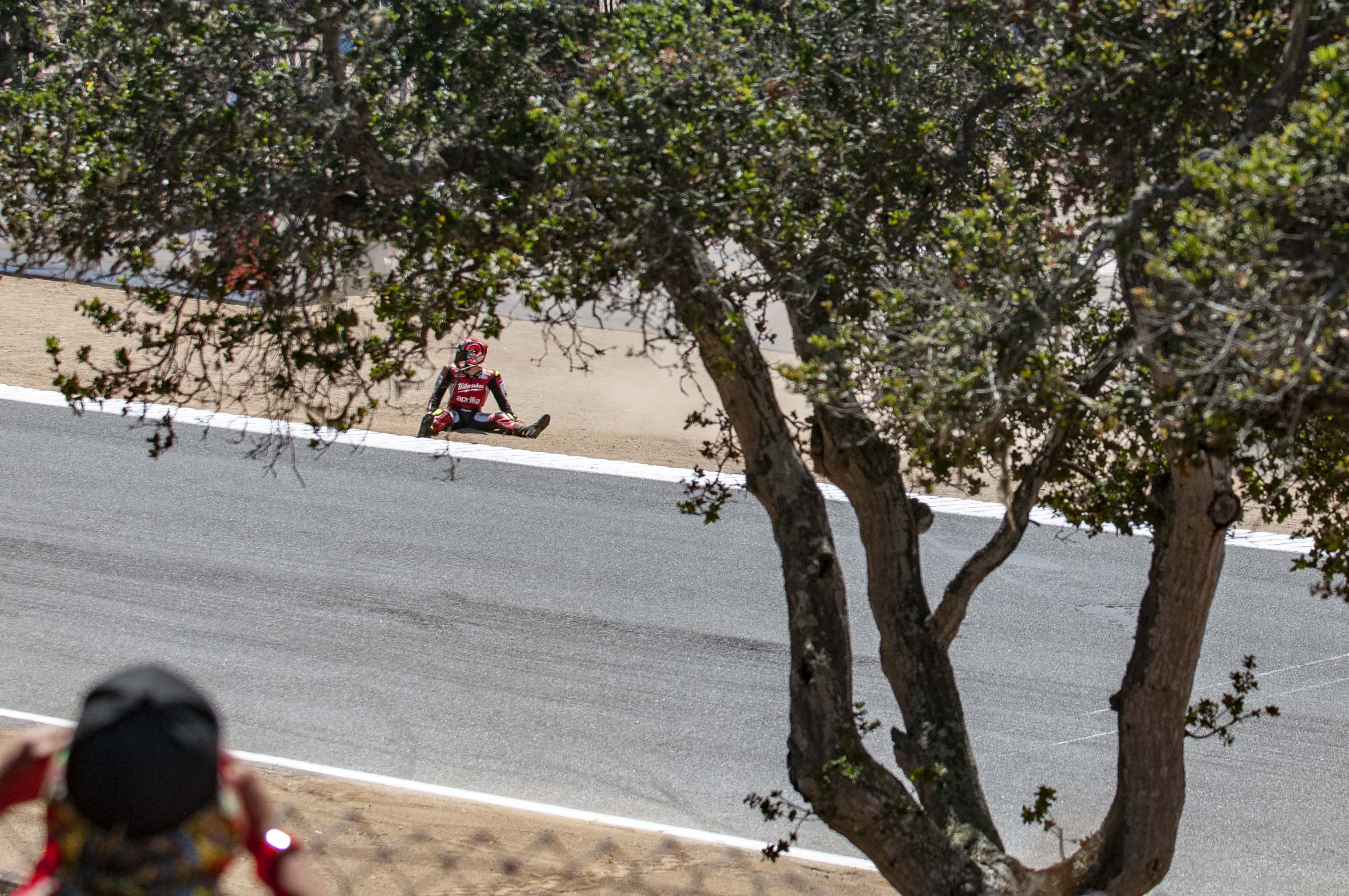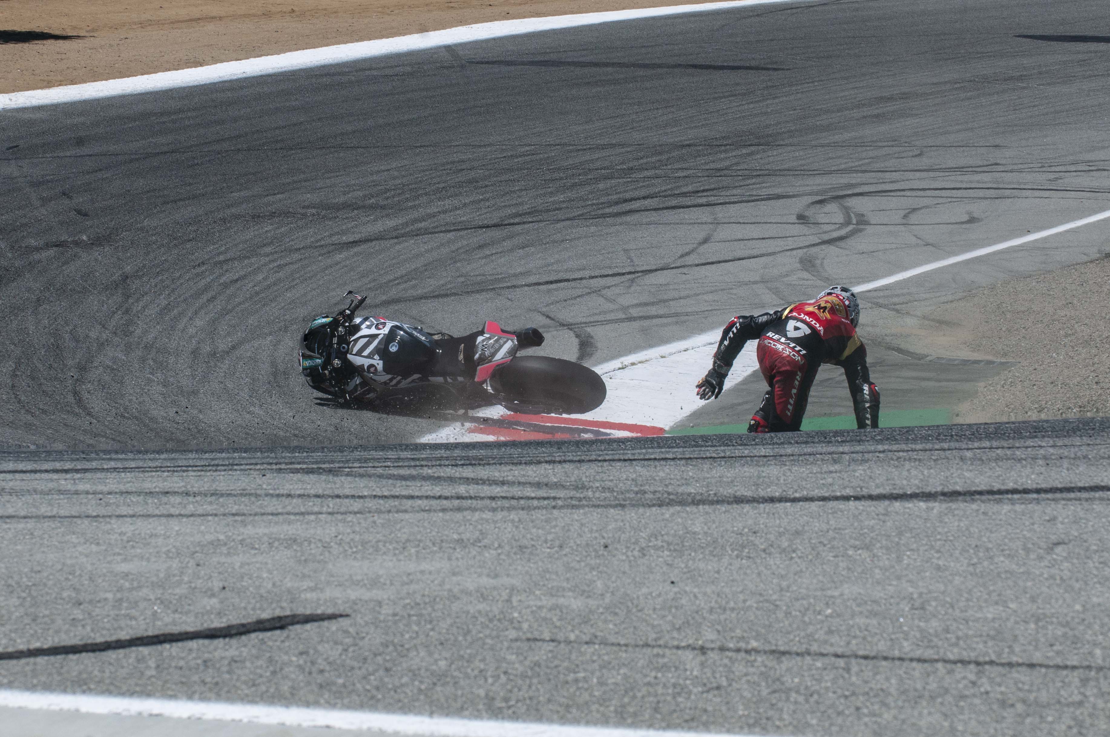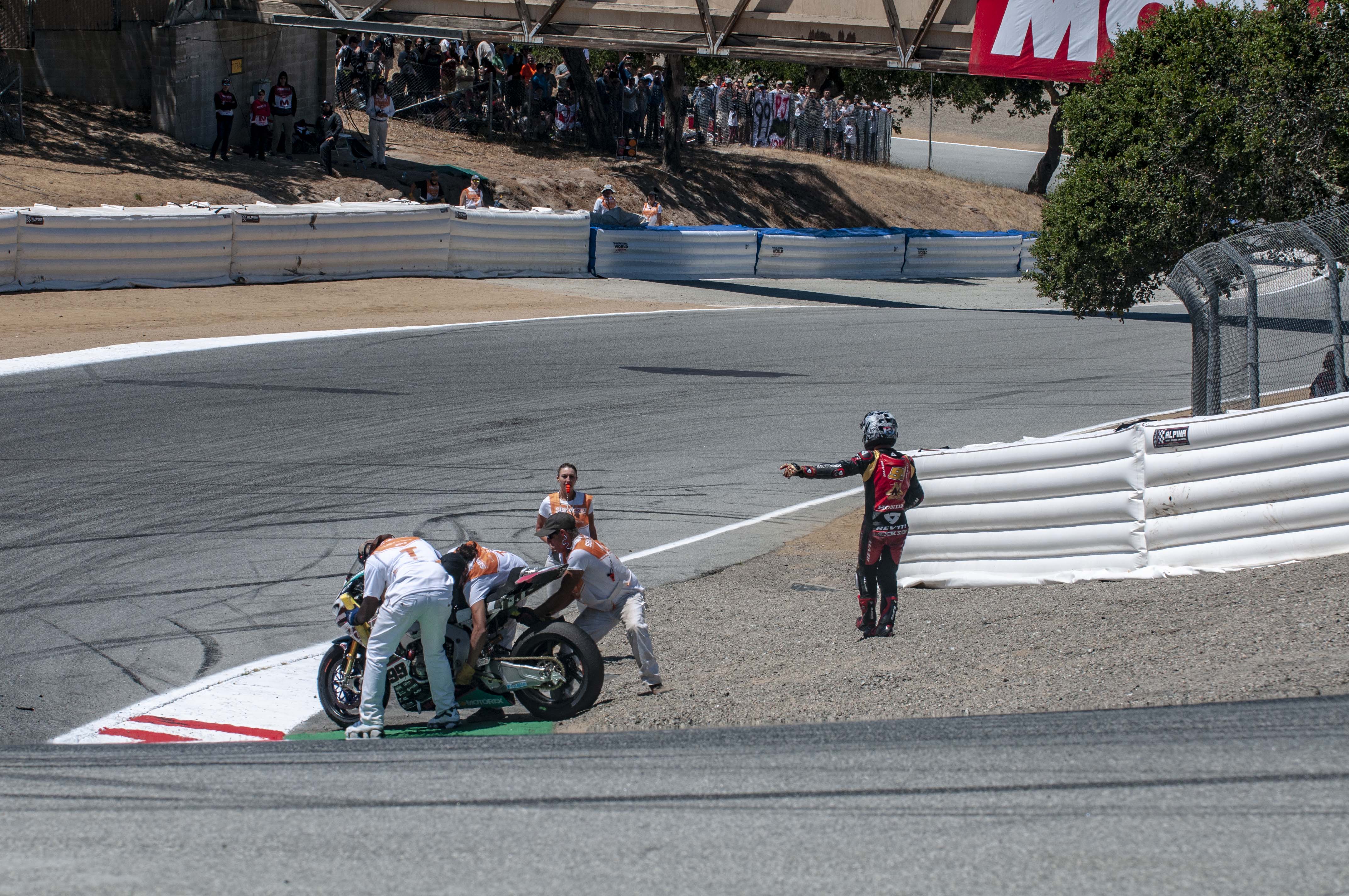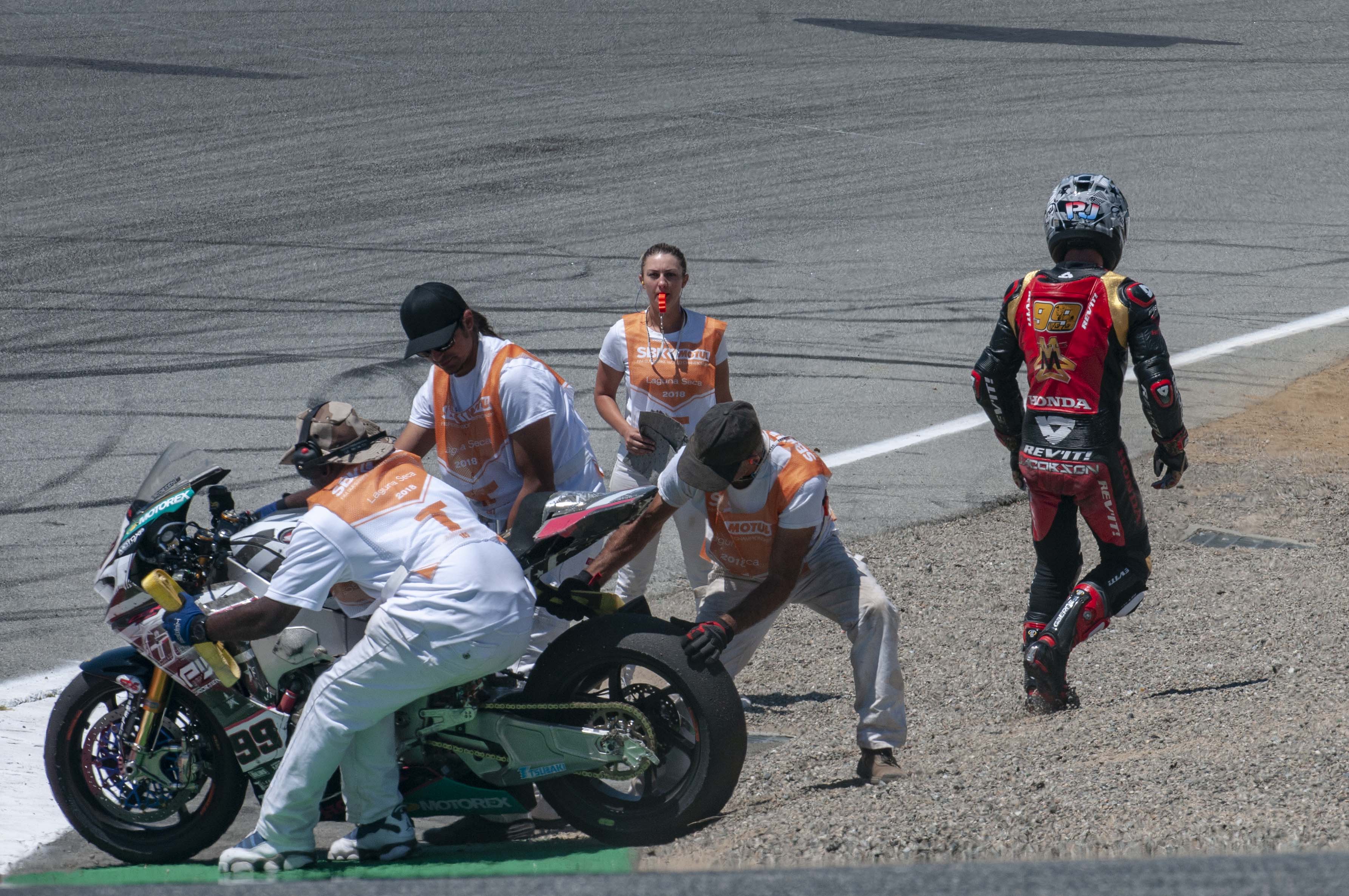 Coming down The Corkscrew I got a sequence of PJ Jacobsen finding the wrong line through the turn, with the marshals facing a very difficult bike recovery situation, which included fluid on the course.