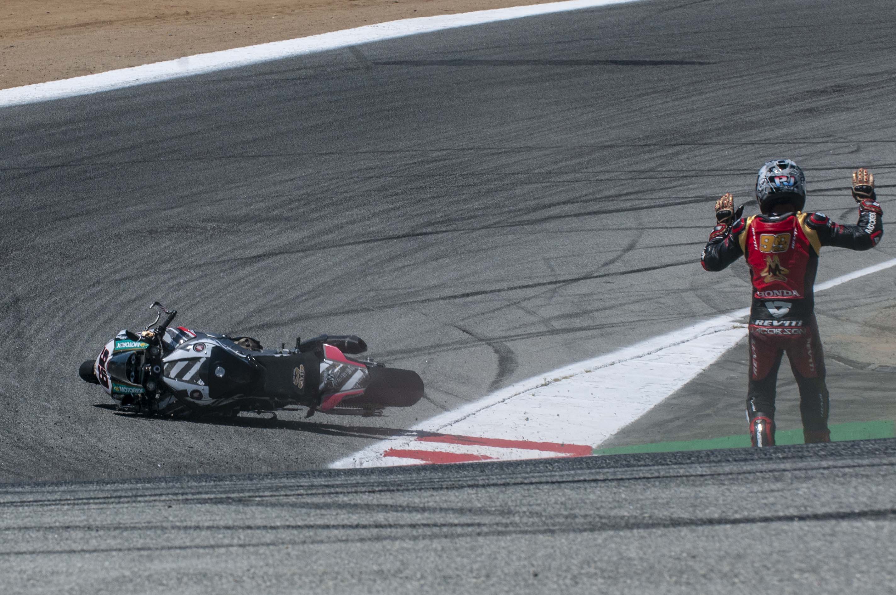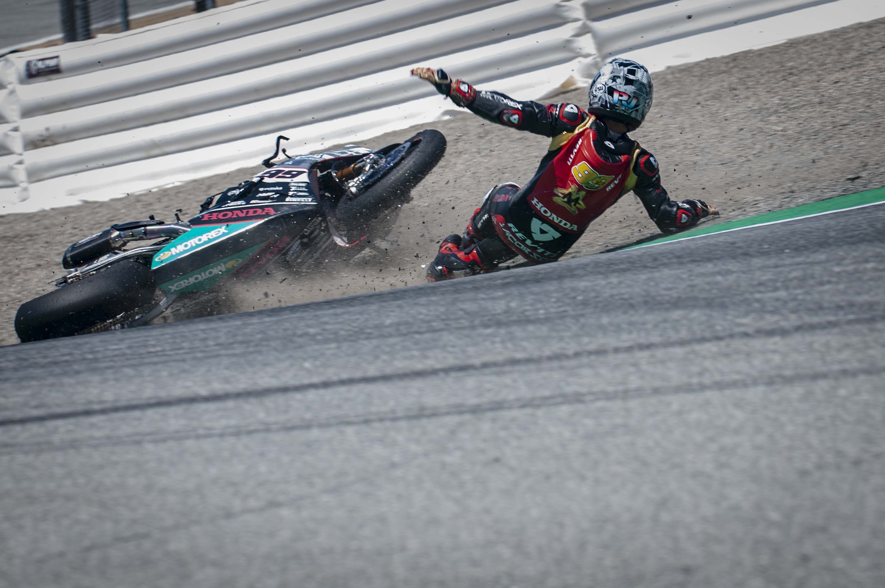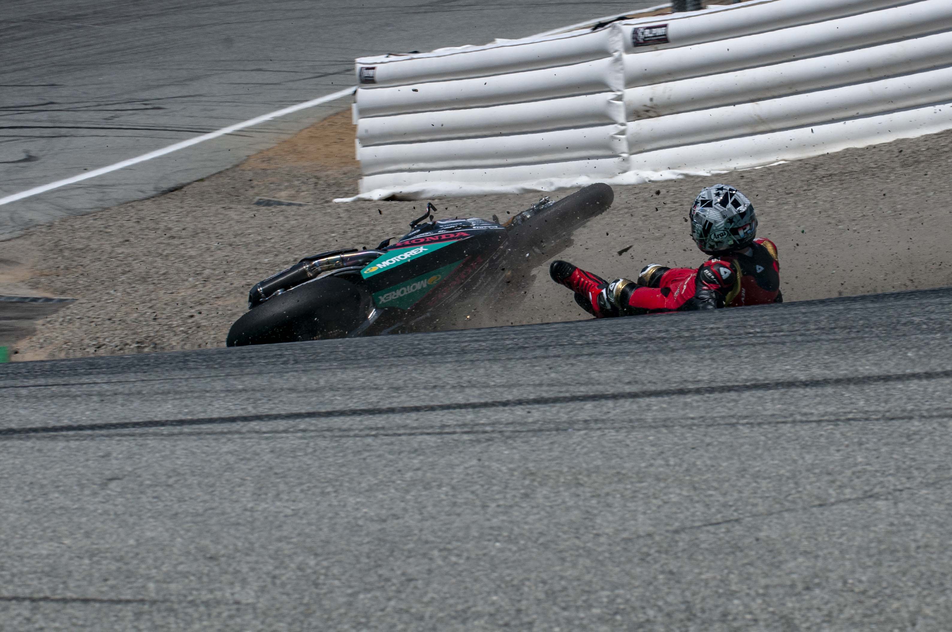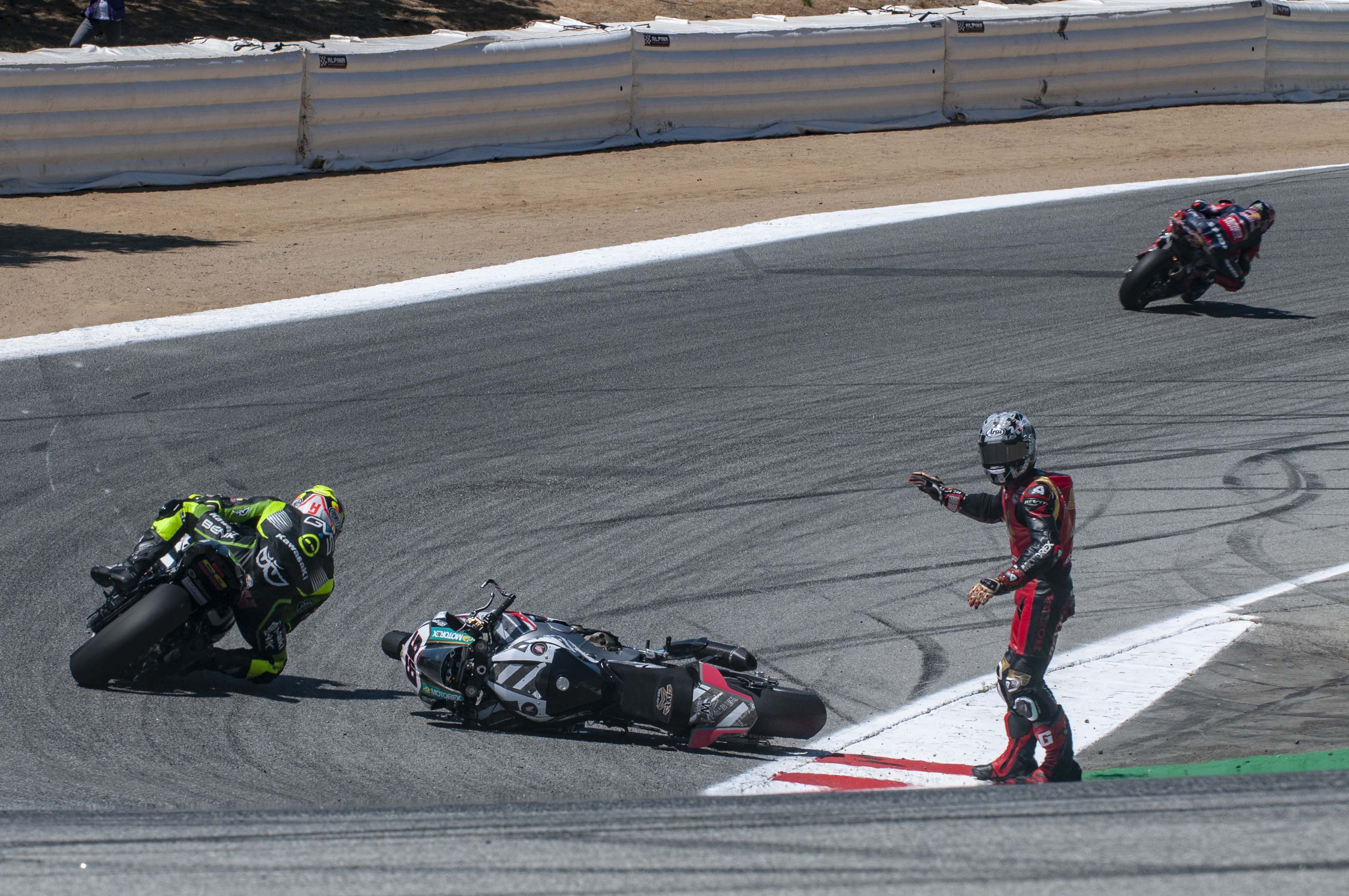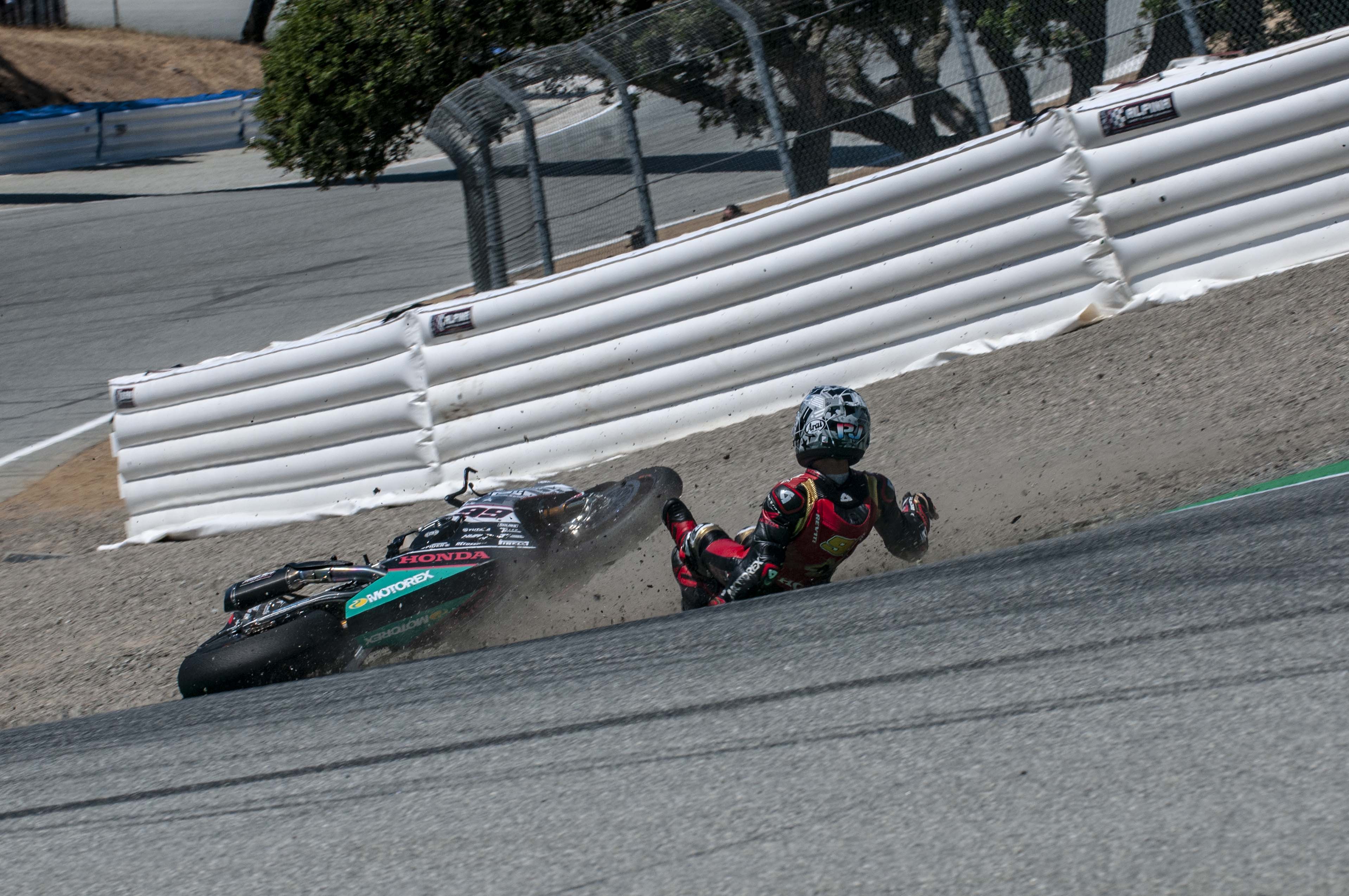 Coming down The Corkscrew I got a sequence of PJ Jacobsen finding the wrong line through the turn, with the marshals facing a very difficult bike recovery situation, which included fluid on the course.
